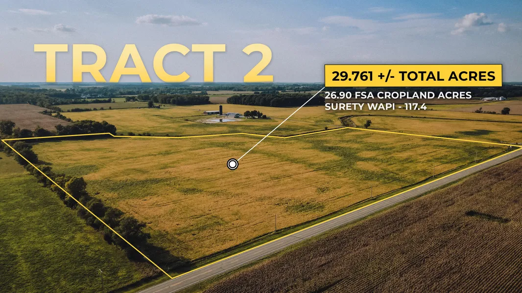 Tract 3: 33.055 +/- Acres total with 31.36 +/- Cropland Acres. The Surety WAPI is 116.7 w...