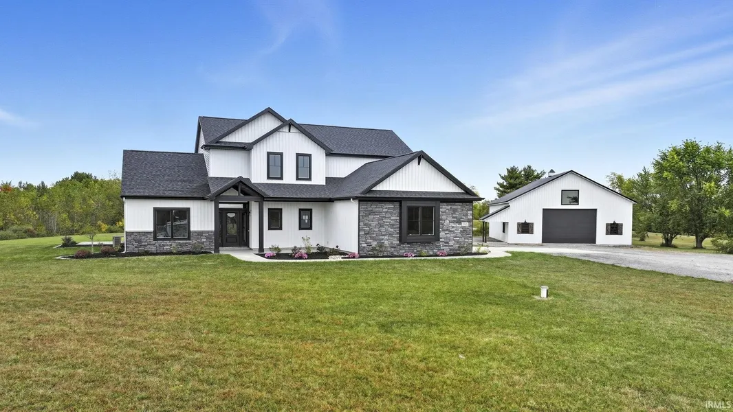 Experience modern country living at its finest! This brand new home by McClurg Builders offers over 2,600 sq ft of thoughtfully designed living space on 4.5 acres. Featuring 4 bedrooms and 2.5 baths, the main level includes a spacious primary suite with dual closets, a double-sink vanity, and a stunning tiled walk-in shower. The gourmet kitchen is a showstopper with custom floor-to-ceiling soft-close cabinetry, quartz countertops, a tile backsplash, walk-in pantry, and all new LG stainless steel appliances. Upstairs, you’ll find three generously sized bedrooms (one with a walk-in closet), a full bath, and a versatile loft/lounge area. Step outside to a huge covered patio with stamped concrete and a built-in firepit — perfect for entertaining or relaxing by the fire. The home also features brand new landscaping with concrete edging and a welcoming front porch. The attached two-car garage is finished with beautiful polyaspartic floors, and the property includes a 40x54x16 pole barn built in 2021 — ideal for storage, a workshop, or hobbies. Every detail has been carefully crafted for comfort, style, and functionality — this home truly has it all!