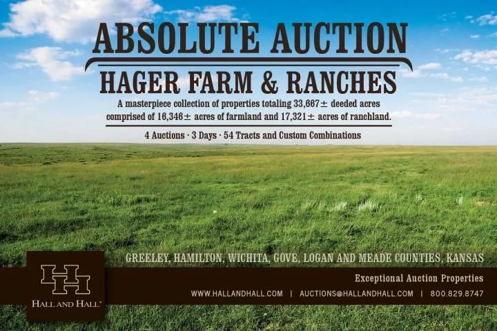 Absolute Auction in Western Kansas - The Hager Farm and Ranch Auction is a collection of properties amassed over several decades. This large holding, totaling 33,667�± deeded acres, is comprised of 16,346�± acres of farmland and 17,321�± acres of ranchland in six counties throughout western Kansas. The farmland will add well to an existing operation or investment portfolio and Buyers will find the ranchland to be well maintained and cattle-ready. The land will be sold at auction in tracts and combinations, making this a tremendous opportunity for Buyers to purchase their ideal property. The extensive line of equipment will also be sold at auction on a separate date.