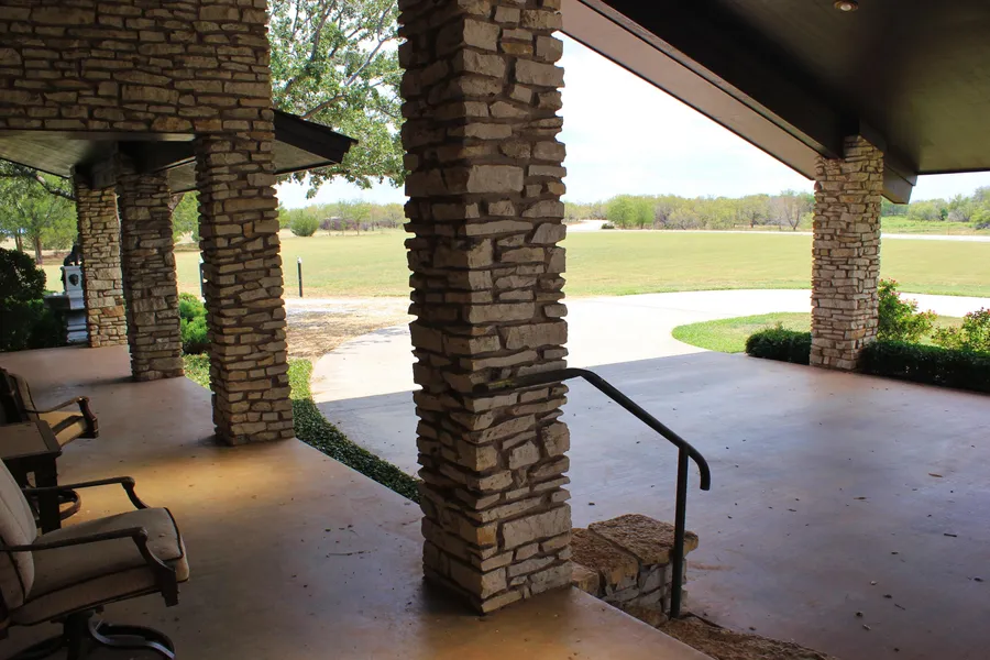 Just off of the bar and living room is the pool courtyard, with flagstone paving and manicured landscaping. Mature live oaks surround the courtyard and provide shade in the hot summer months. The pool is kidney shaped and is replenished from the stone waterfall that flows into it. It has recently been serviced and is in good working condition.