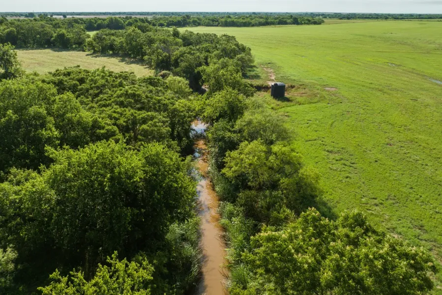 The majority of the property consists of about 60 acres of highly established coastal bermuda that could be hayed or grazed, with the balance being heavily wooded with Pecans, Elms, Cottonwoods, Hackberry, and Chinaberry that grow along the creek that runs throughout the property. An irrigation ditch that runs along the north and northwestern boundary spills into the creek and during summer months and creek has water year-round per seller. A small part of the property along the creek is located in the floodplain. The property has goat wire perimeter fencing in excellent condition and a small set of cattle pens that are located in the northeast corner of the property.