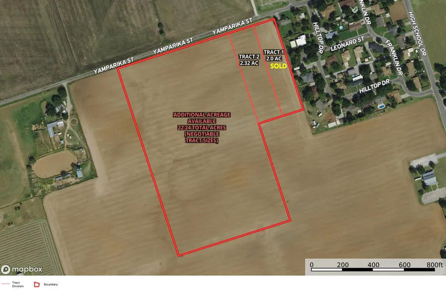 TRACT 2 | This 2.32 acre tract of land is located along Yamparika St in Vernon, TX, across the road from the new elementary schools construction site. The high school football stadium is adjacent to this tract, across the paved road. The tract has a new survey plat and is 164.65 ft wide (road frontage) x 616.72 ft deep. Electricity, city water and sewer are all located across the road from this tract.