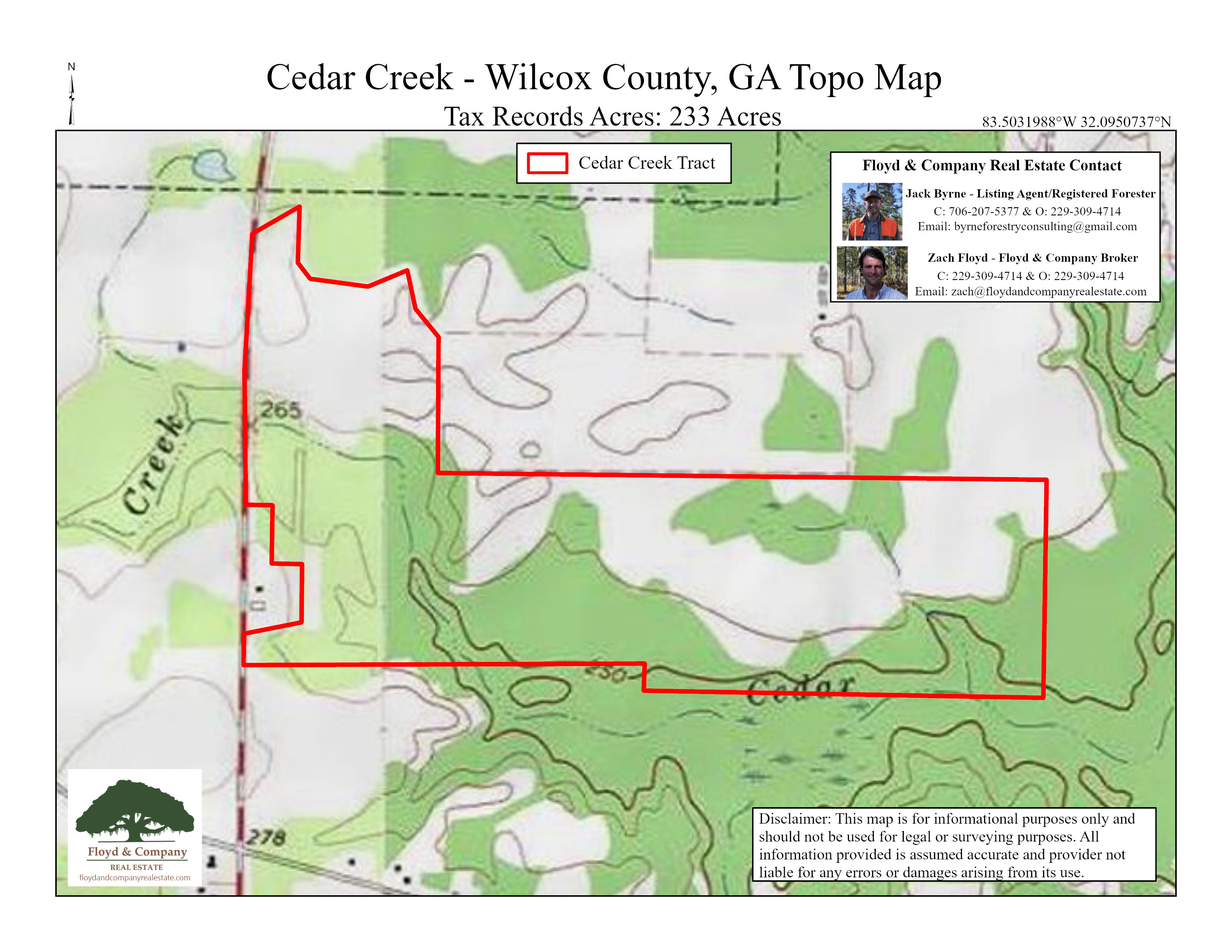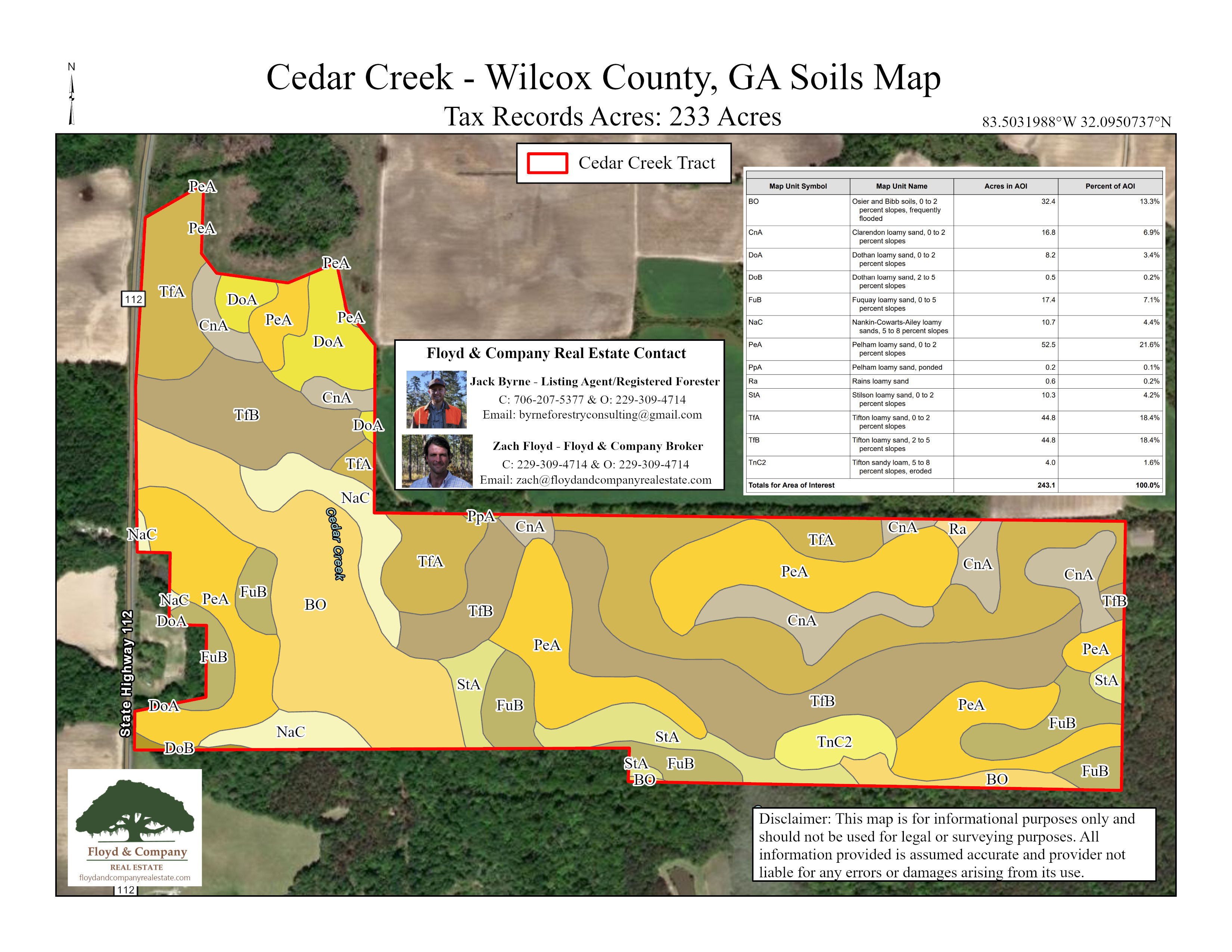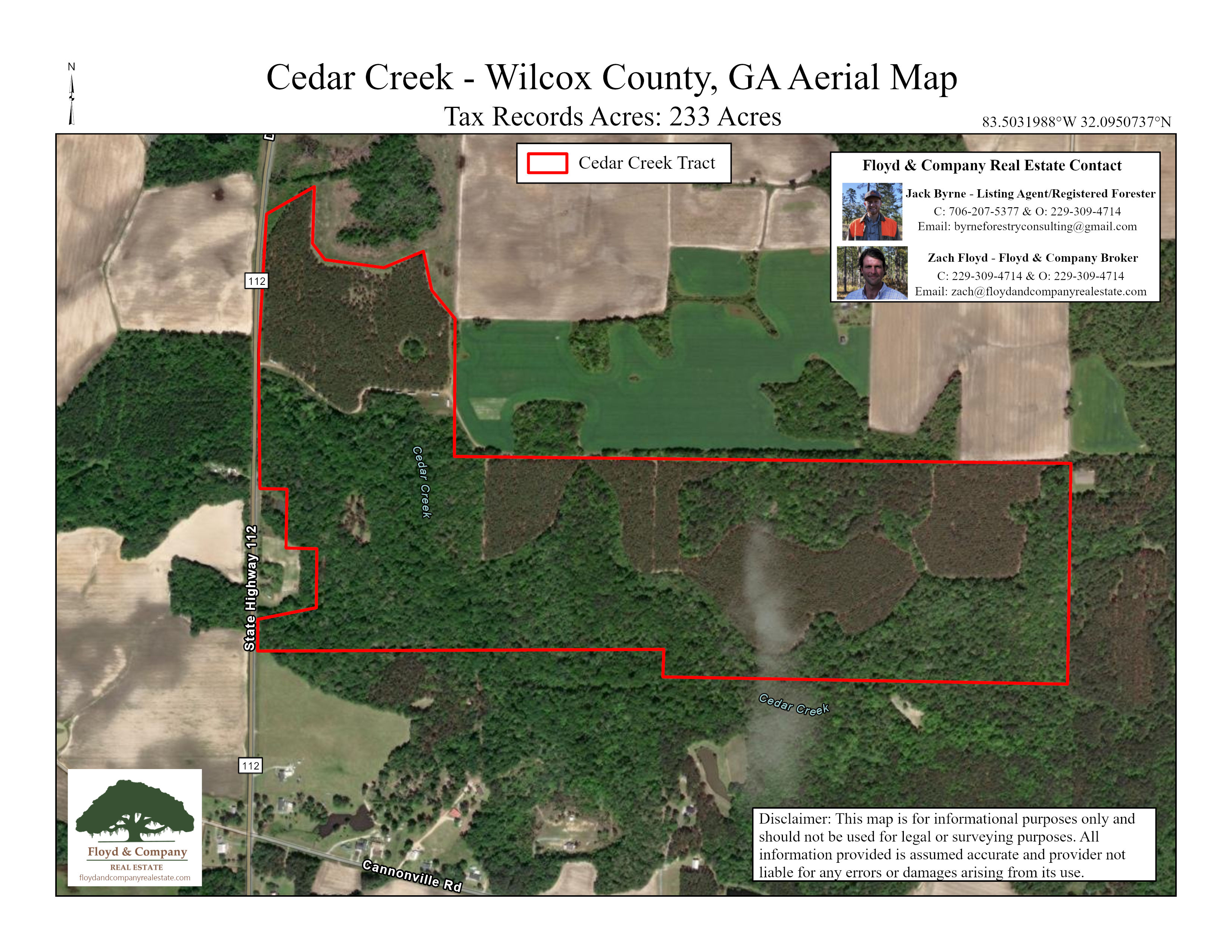 Cedar Creek Tract is a recreational timber property located south of Pineview, GA and is now on the market for purchase. The tract consists of +/- 233 acres with roughly 2,200 feet of road frontage on GA 112. The property has been managed for wildlife, with abundant whitetail deer and turkeys. The farm offers an excellent long term timber investment, with +/- 90 acres of mid rotation planted longleaf pine, approximately 18 years old and currently in pine straw production. The remaining +/- 138 acres consist of mature hardwood stands ideal for wildlife habitat, with Cedar Creek running through them. Wildlife food plots are located on the property and consist of +/- 3 acres. Cedar Creek Tract is a revenue-producing property perfect for the outdoorsman. Schedule a showing appointment today.