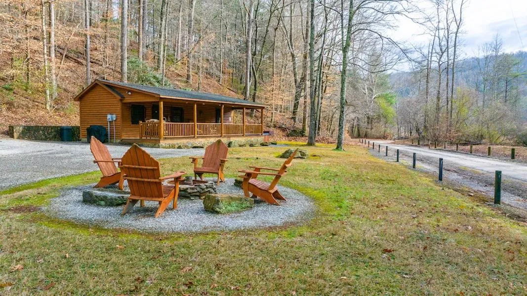 Outdoors, enjoy a peaceful retreat by Rocky Creek, which flows through the property and includes a small waterfall and a cozy waterside picnic area. Enjoy sitting beside your choice of either firepit located in the front yard or along the creek. The property extends to the creeks center and is perfect for nature lovers. Relax on the porch swing and take in the beauty of your surroundings.