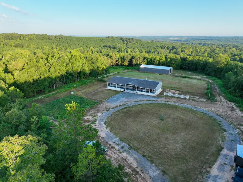 Situated on the highest point overlooking the property, this stunning home is the essence of country living. As you enter through the private drive, you will find the homesite of roughly three cleared acres holding the 2022 Kabco Builders manufactured home, shop, large garden, and fenced yard. A beautiful front porch spans the width of the home and is perfect for sipping your morning coffee as you watch the sunrise. When you enter the home, you are greeted by the large living area with a stone fireplace and spacious kitchen. The roomy primary suite sits nearby with a beautiful walk-in shower, double vanity, and hidden room behind the built-in shelves. On the other side of the living area, you will find the spacious eat-in kitchen with a walk-in pantry. The kitchen window overlooks the fenced yard, looking downhill toward the metal shop. Three additional bedrooms, two full bathrooms, and the mudroom are situated on this side of the home. The metal-enclosed barn is located behind the home. It measures 30x80 with two rollup doors and is wired for power. Additionally, another 40x60 slab with brackets is installed further into the property for your future farm or homesite expansions. For the grounds of the property, the rolling terrain is lined with a trail network throughout the property, providing access across the tract. A well services the home but a second has been permitted for future expansions. Finally, the two nearby transformers have ample space for additional homes or shops as you turn this property into your country retreat. This beautiful home will not last long so reach out today to learn more about this amazing property.