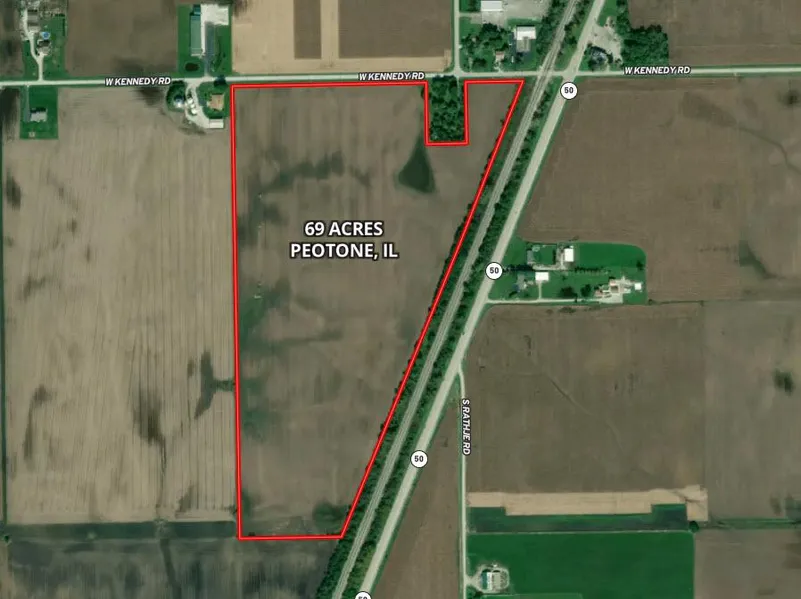 69 Acres on the south-side of Peotone. Less than 2 miles to I-57 interchange. Nice long term development potential, priced as farmland. Frontage on Kennedy Rd and at the "T" intersection of Rathje Rd. The farm is parallel to Rt. 50 on the west side of the CN railroad tracks.