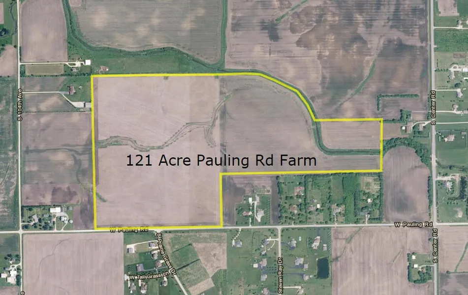 121 acres with the Will County E-2 residential zoning. The property has frontage on Pauling Road across from Whispering Prairie Subdivision. Less than one and a quarter miles east of Route 45 (La Grange Road) and just over 2 miles to Green Garden golf course and country club.
