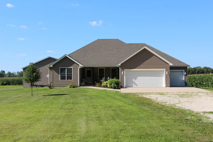 COUNTRY LIVING AT ITS BEST!!! Sit back and watch your corn pop up in rows on this well-maintained, income-producing property, including a 2300 square foot ranch house with an attached 3-car garage and 40X60 outbuilding!! Set back nicely along a quiet road in a country setting, you’ll enjoy amazing views of sunsets, deer grazing in the distance, songbirds and life at a slower pace. This super clean ranch-style home will spoil its new owners featuring wood laminate flooring, vaulted ceilings, 3 bedrooms, 2 full baths, tiled whirlpool soaking tub and walk-in closet in the master bedroom. As you enter the home, your attention is drawn to the high ceilings and open layout, which lends a particular brightness to the space. A nice sized dining room for entertaining guests is located off the foyer to your right. Following the open flow layout leads to an incredibly spacious living room with ampl...