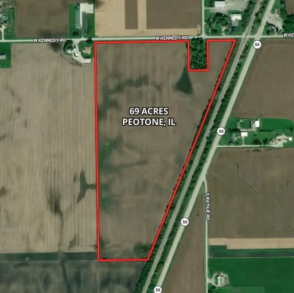 69 Acres on the south-side of Peotone. Less than 2 miles to I-57 interchange. Nice long term development potential, priced as farmland. Many potential uses other than agriculture production. Great location for your business. Frontage on Kennedy Rd and at the "T" intersection of Rathje Rd. The farm is parallel to Rt. 50 on the west side of the CN railroad tracks.