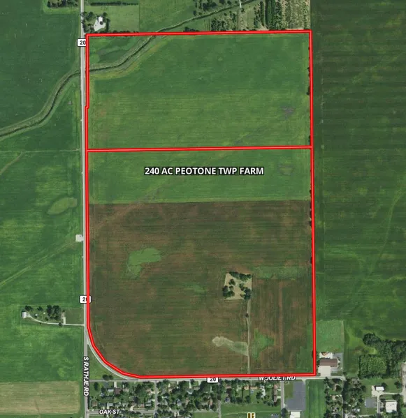 240 acres of vacant farmland for sale in Will County, IL. This property is a combination of three connecting parcels located just outside the city limits north of Peotone, IL. With an average Soil PI of 125.5, approximately 227.56 tillable acres, a large amount of road frontage/access, and close proximity to both a state highway and interstate, it is a prime location for continued agricultural use or possible redevelopment.