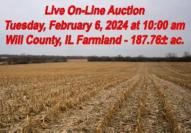 Will Co., IL Farmland Auction on Tuesday, February 6, 2024 at 10:00 a.m. of 187.76 total tax acres being sold in 1 tract. There are 171.78 FSA cropland acres with Soil PI of 121. Improvements include machine shed, outbuildings. Recorded land easement with neighboring landowner.