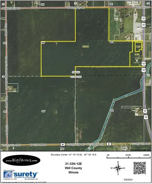 139 acres of prime farmland about 7 miles west of Peotone, IL. Located off the southwest corner of W Kennedy Road and US-52, this property has over 94% tillable acreage with a Soil PI of 125.6. Ownership said there has been extensive tile work done on the farm. Primary access and frontage is right on Rt. 45/US 52 straight across from Prairie Creek Grain.