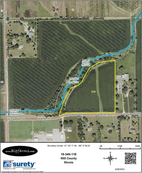 Rare 10 acre parcel in the Lincoln-Way high school district. This 10.6 acre parcel is available just outside the western Manhattan, IL city limits, located off the northeast intersection of Cherry Hill Road and W Sweedler Road. It has Soil PI of 122.3 and approximately 8.98 tillable acres. While the current farm has rich and productive soil, there is also a possibility for development with continued single family residential development just to the east and south of the property. An approximately 32 acre connected parcel, listed separately, is also available.