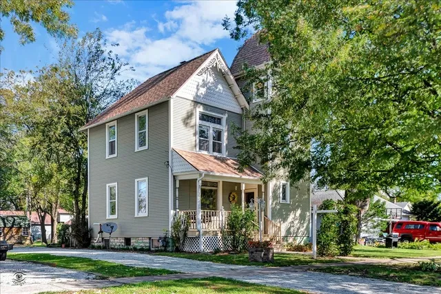Elegance and charm is showcased in this 3 story Victorian home. In the heart of Peotone, IL., this home holds 3 bedrooms all with walk in closets, custom windows, and original detailed door knobs. The front foyer boasts a one-of-a-kind stair case with beautifully hand designed wood railings. In the front living room, natural light shines in through large windows, complimented by hand-made stained glass that looks out onto your covered front porch. The formal dining room has custom hardwood flooring and a vintage built in butlers pantry, in true 1880's style. The updated kitchen has soft close cabinets and a large walk in pantry, with access to the wrap-around back porch and a second stair case to the second level. Two full bathrooms were recently updated, but still left with vintage charm. The 2nd level laundry room is spacious enough for double use. On the 3rd floor, the "Cinderella Room" awaits your creative doing!