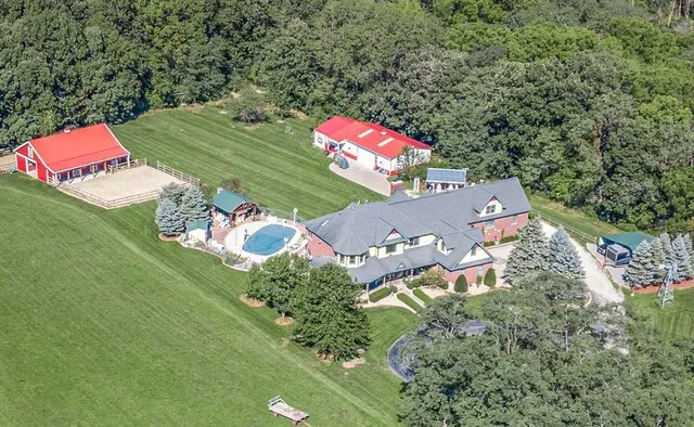 LARGE CUSTOM BRICK VICTORIAN HOME NESTLED ON 7.5 PRIVATE ACRES WITH STOCKED POND * 7,200 Sq Ft of Total Living Space * 33 ROOMS IN 3 SEPARATE RELATED LIVING SPACES * Main House is 3,700 Sq Ft * 5 BR, 3.5 BA, Gourmet Kitchen * 2-story Foyer and Family Rooms * 2 Laundry Rooms * TWO In-Law Living Suites * EAST WING: 1350 sq ft, 2 BR plus Loft, 1 BA with Laundry, 2nd Kitchen, 2-Story Living Room * FINISHED WALK OUT BASEMENT: 2,150 Sq Ft, 3rd Full Kitchen, Wet Bar, 2 Game Rooms, Dining Area, Family Room with Wood Burning Stove, 1 BR, 1 BA * 7 CAR ATTACHED GARAGE (3-Car and 4-Car)* HEATED IN-GROUND POOL: Fiberglass with slide surrounded by stamped concrete, brick pavers and fence * PERGOLA with brick outdoor fireplace. * TIKI-GRILL area (screened-in) with refrigerator and fireplace/table. * 4-6 STALL HORSE BARN * MACHINE SHED / CAR SHOP - Heated, Insulated, Finished * Zoned A-1 = Lowest Taxes ...