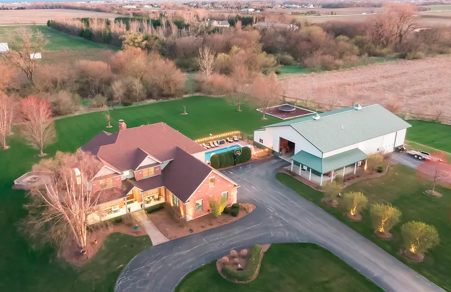 Sprawling 13+ acre private estate is a dream come true. Long gravel driveway past your fully stocked pond with fishing pier and lit fountain. At over 5,000 sq. ft. above grade, this is a mansion for sure but not at all pretentious. More like your favorite friend that knows all your likes and that you can't wait to return to after a long day. Circle drive to paver patio and covered front porch to welcome your guests. Dining room with decorative ceiling and butler's station for formal gatherings. A flex space with double pocket doors can be used as living room, study or even a main level bedroom if needed. Great room with 2 sided fireplace unites the chef inspired kitchen. High end appliances, including a double oven, expansive refrigerator with beverage center, walk-in pantry and 2 tiered complimenting island with 2nd sink and seating for 5. There is room for all to prepare the most gourmet meals. Breakfast nook engulfed in windows opens to paver patio and fenced, 9 ft deep saltwater in-ground pool. Other outdoor entertaining spaces include a deck off the living room and the primary ensuite. Bonus large patio with fire pit and pond views. Stunning wood staircase to loft area uniting four spacious upper level bedrooms each with access to a full bathroom. Open balcony to the gorgeous great room below. Primary is a "spa like" escape all its own with a vaulted ceiling, cozy fireplace, rich cabinetry, jetted tub and separate shower. Step out and enjoy private views of your estate grounds. Sprinklers keep it lush effortlessly. Separate garage access from the loft upstairs and from the unfinished basement. Lower level features a dual sided stone fireplace and is ready for expansion if needed. Every detail has been considered. Home office command center on main level with attached mudroom and bathroom. Attached 3 car garage. Container to hold salt is conveniently located in the barn. No lugging bags to the basement. 400 amp service to home. 50 x 80 outbuilding with 16 ft. walls and 14 ft. doors. 2 lofts, a private office, full bath and a pool storage area. Heated and cooled office with 100 amp service to outbuilding. A definite "work from home" option or store your toys, the possibilities are endless. 25kw generator. New roof in 2020 and water heaters 2021. Custom lighting package highlights this dream estate perfectly. Off the beaten path, but within a short drive of shopping, dining and entertainment. Great School District including Lincoln-Way West High School!