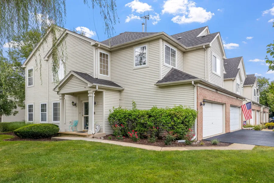 Hurry to view is end-unit townhome in popular Willow Walk. Impressive cathedral 2 story entry with plenty of sunshine pouring in as natural sunlight... Open staircase and railing. Living room is open to the dining room eat-in kitchen has Cherrywood 42" cabinets, ceramic tile backsplash and ceramic flooring plus a closet pantry and sliding patio doors to the outside patio. Home also has a hearth room with gas heatilator fireplace. It is the Linden Model which is one of the largest and being an end-unit it has more windows. 2 bedrooms plus a loft upstairs, laundry room is upstairs also. Master bedroom has cathedral ceilings and has a full bath, double sinks with seperate shower and soaker tub, master bedroom also has a huge walk-in closet. Double closets in the second bedroom. There is a half bath on the main-level, 2 car attached garage wth opener and transmitters. Great area.... nice that association dues include exterior maintenance plus water and sewer. New air conditioner 2019, furnace 2020, water softener 2021... Association did new roofs 2022. Parks, schools, shopping and expressways are all close.