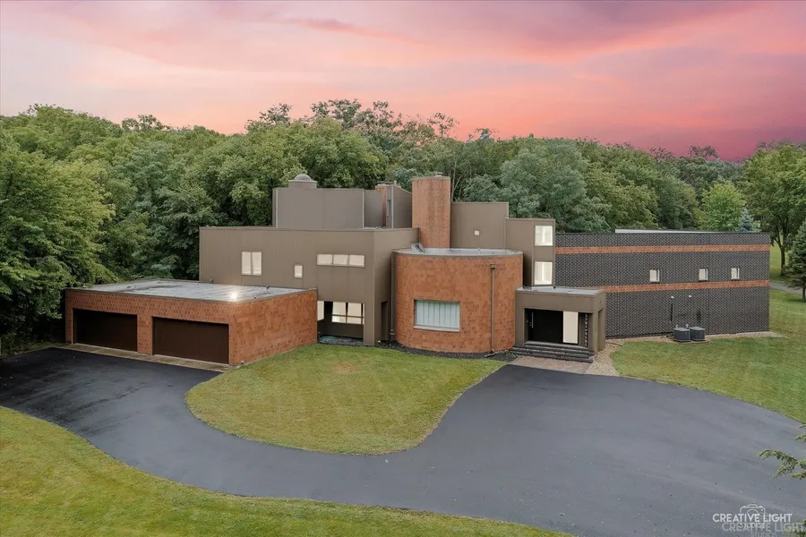 Located 50 miles south of the City of Chicago, just 10 minutes from Hollywood Casino Joliet and less than half a mile from Joliet Municipal Airport, sits this striking contemporary masterpiece set on five private, wooded acres. Encompassing nearly 10,000 square feet, this architecturally significant residence-built in 1983-offers clean lines, dramatic cathedral ceilings, expansive walls of windows and a dynamic multi-level floor plan designed for exceptional entertaining. The home features an indoor guitar shaped pool, spa, and basketball court. Designed to host on any scale, the home provides numerous gathering spaces, funky conversation pits, a wet bar, and an open, flowing layout that allows guests to comfortably occupy multiple areas at once. Throughout the home, six fireplaces add warmth, ambiance and character. Curved and spiral staircases, along with an elevator, enhance both func...
