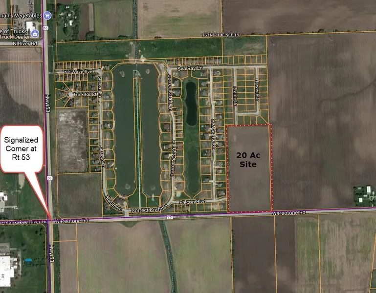 20 aces with residential development potential. Zoned R-1 Single Family in the City of Wilmington. Excellent road frontage with utilities at the site. Near the corner of Rt. 53 and Wilmington - Peotone road. The 20 acres is on the east side of Waters Edge Subdivision.