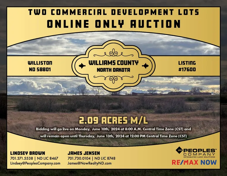 Offering Two Lots in Williston, Williams County, North Dakota land through an ONLINE ONLY AUCTION where all bidding must be done online through Peoples Company's bidding application. Bidding will go live on June 10th, 2024 at 8:00 A.M. Central Time Zone (CST) and will remain open until Thursday, June 13th, 2024 at 12:00 PM Central Time Zone (CST) with closing taking place on or before July 17th, 2024. A bid placed within 3 minutes of the scheduled close of the auction will extend bidding by 3 minutes until all the bidding is completed. If you plan to bid, please register 24 hours prior to the close of the auction. Under no circumstances shall Bidder have any kind of claim against Peoples Company or its affiliates if the internet service fails to work correctly before or during the auction.