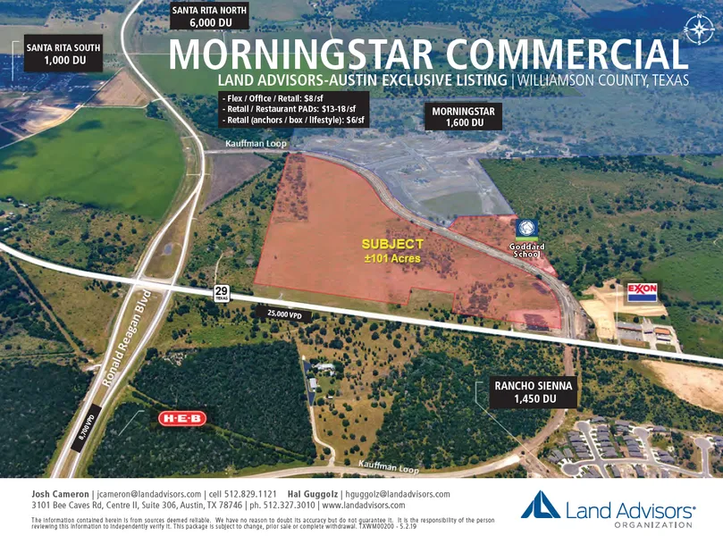 COMMENTS The Austin MSA has experienced exponential growth over the past few decades. The Ronald Reagan & State Highway 29 corridor has been at the epicenter of this tremendous growth. Currently, There are 22,125 future lots in new home residential subdivisions planned in this corridor. Many of these new residents are commuting to employment centers located just south in and around the Cedar Park & Round Rock areas. Within a one mile radius of Morningstar Commercial there are over 12,000 new homes planned and under development with over 30,000 projected residents.