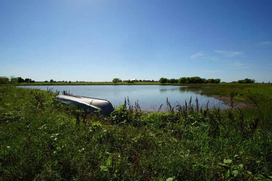 A wet weather creek and sloping terrain supply a 3 acre stock pond.