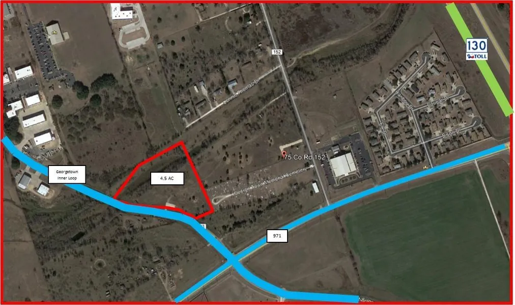 4.5 AC with excellent visibility on Georgetown Inner Loop. This area is expecting high growth. Great location for office, light industrial or retail uses.