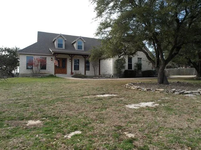 Hill country custom stone home nestled among mature oaks on 1.65 acres.Backs to greenbelt ranch land. Crown molding. Granite countertops with tile backsplash.Breakfast bar opens to family and breakfast area.Black appliances.Walk-in oversized pantry. Master separate from other bedrooms. Patterned neutral tile in kitchen, utility, baths.Neutral carpet in bedrooms.4th bedrm up w 3rd full bath. Gameroom up. Covered back patio w cedar plank ceiling, ceiling fans.Hardwd flrs entry, family,hall,study,master.