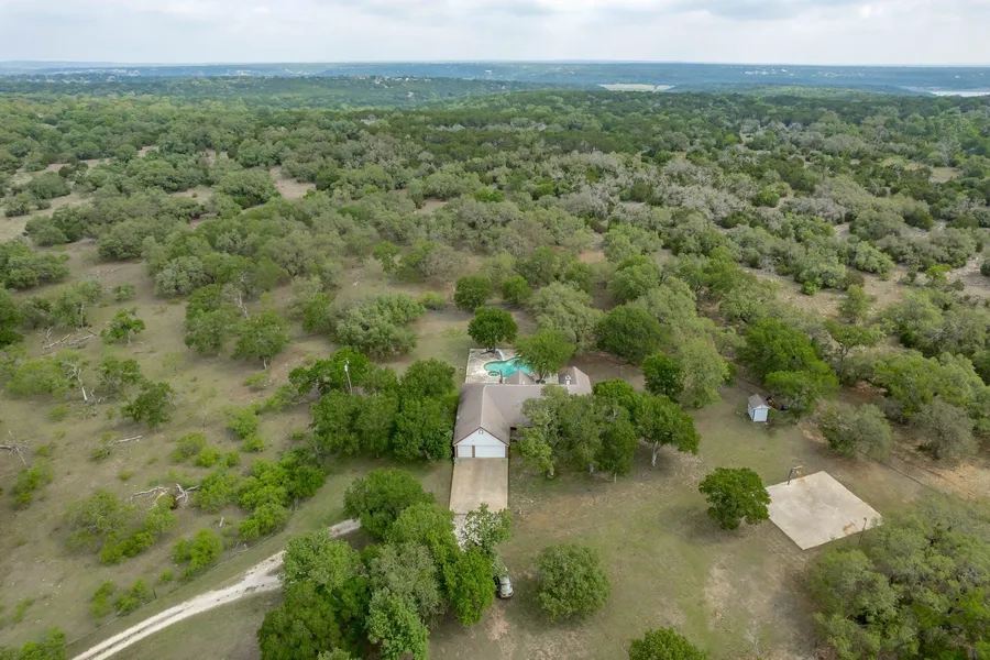 UNDER CONTRACT - 15 AMAZING acres with one story home, 4 bds/3 full baths/3 car garage, inground pool, private well in well house, lighted sports court and more! Home has high ceilings, open floor plan with wood burning fireplace in living. Primary bedroom has a sittting/office area and it's own full bath with double vanity and double walk-in closets. Kitchen has a water filtration system, center island with sink and is open to living and dining. Large covered backporch overlooks the pool which has a diving board and waterfall. Large trees shade the home and help keep utilites low. This property is located in a private location, near upscale homes, in Geogetown ETJ. The property is lightly restricted, which should not prevent the property from being subdivided. The AG EXEMPTION is maintained by a grazing agreement with neighbor. 14 of the 15 acres is ag exempt. The land has an abundance of hardwoods and is mostly level with some gentle sloping topography. A new roof will soon be installed. A new roof was installed in July 2022. In 2021 the pressure tank, booster pump, tank float, pool pump and chlorinator was replaced. Property is in Georgetown ISD.