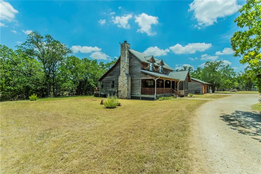 This is the perfect Texas country home!! The long winding driveway curves around large oaks to approach the storybook style wooden home. The cool and shady wrap around porch looks out at your almost 8 acres of shade trees and wild life. Highly secluded property for your private enjoyment. You will love the wood burning fireplace this winter and the large country kitchen with gourmet gas stove and electric oven. Enjoy your coffee on the porch in the morning or in the dining area surrounded by windows. This home is comfortable, adorable, and in the perfect location. Primary bedroom, half bath and huge utility room are downstairs. Two more spacious bedrooms, one with a murphy bed, and full bath are upstairs. Detached 2 car garage for parking. Drive a bit further onto the property and you will find an over 1000 Sq. ft metal workshop with additional squarefootage of covered area. This propert...