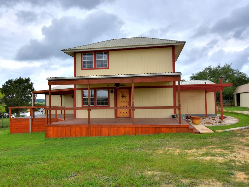 Totally custom, updated, and immaculate home on 11 beautiful acres! Enjoy the incredible views of the hill country and large pond from your covered and wrap around deck! Features include 5BR/3BA, custom woodwork, 200-year old oak floors in the kitchen as well as tile & laminate flooring, 2 living areas, fireplace, built-ins, jetted tub, & more. House has recent siding, recent well, metal roof, and there is a workshop and storage building. Ag Exempt for lower taxes. Only 45 min to downtown Austin.