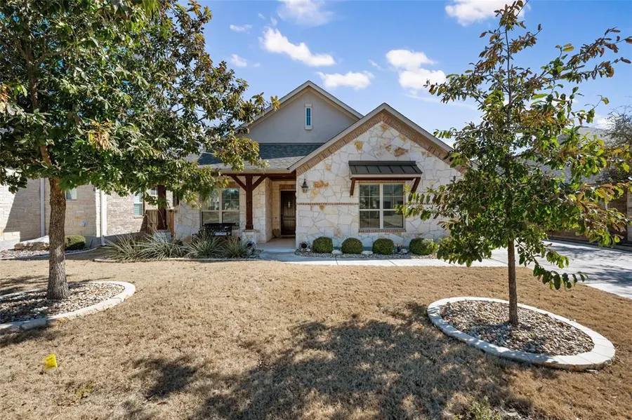 Positively stunning single story pool home in Highlands at Mayfield Ranch. This home offers a welcoming exterior with its covered front porch and backyard oasis which is just the start of the ooohs and ahhhs for this home. Step inside and you'll instantly fall in love with delightful features and floor plan. The entry offers hardwood wood flooring that continues throughout the main areas. Gather in the Great Room and enjoy the cozy fireplace. The kitchen has a timeless look and offers an abundance of cabinet space along with a large island, stainless appliances and quartz counters. The expansive Primary Suite boasts floor to ceilings windows making it feel like a hotel suite. A spa like experience awaits you in the Primary Bath with soaking tub and large walk-in tiled shower. There are three spacious secondary bedrooms: one, with its own en-suite and walk-in closet. The additional bedrooms are connected to a shared full bathroom. Saving the possibly the best for last, you might spend more time outdoors with the heated pool and spa. This outdoor oasis will be your favorite memory making spot for years to come. The community offers monthly events, a pool, splash pad and kiddie pool. Walking distance to the trail access which leads to nearby Williamson County Regional Park. Additional add-ons include: Full gutters, alarm system, high end water softener, epoxied floor, ceiling storage racks and additional lighting in single car garage