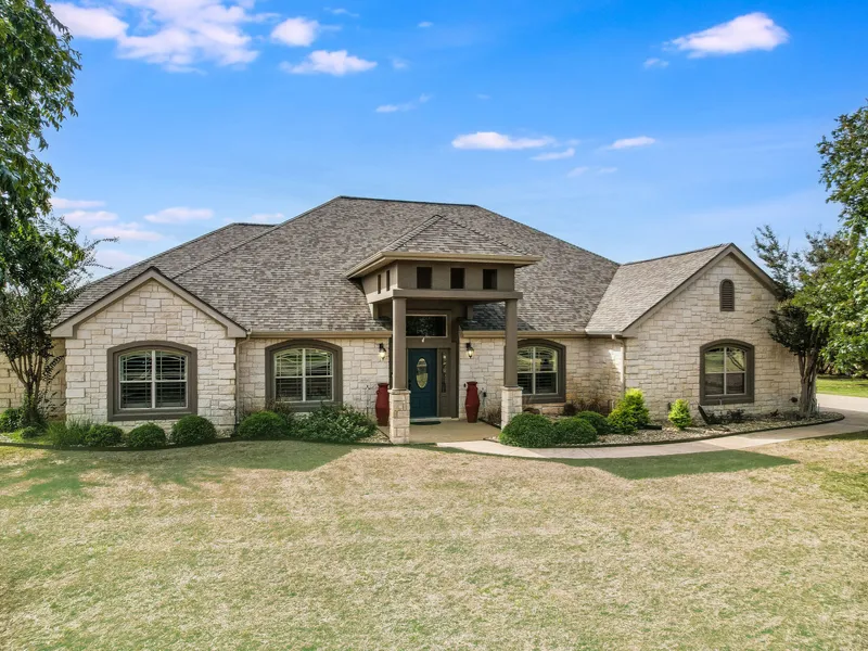 CUL-DE-SAC PRIVACY: from the covered patio no other houses, no roads, no sheds, no privacy fences are visible. Your fenced back yard and your native Texas woods beyond the fence is the view. Located on a 1 acre cul-de-sac site, no through traffic. A separate garage/workshop in addition to the attached 2-car garage has ample power, lighting and attic storage. All your vehicles and projects have a home! FLOOR PLAN: Well-designed, the floor plan provides the space you need without compromise. Generously sized rooms are thoughtfully laid out and separated. The primary suite is tucked away in its own wing. No need to tiptoe around—come and go as you please without waking others. Entertaining is a joy! No need to pare down the guest list, invite everyone! The big dining room can easily accommodate a really large Holiday table and buffet. The island kitchen features separate work spaces, a pantry, bar seating and is open to the casual dining area and the main living area. A monumental stone fireplace (wood burning, the real thing!) anchors the living area. Plenty of wall space allows a giant TV, thus eliminating the awkward fireplace-with-TV-on-top arrangement. A large dedicated office is off the foyer, a closet holds files and gear. ARCHITECTURAL DETAIL: Knotty Alder doors, scraped hardwood, tile and stone floors, recessed lighting, high ceilings with crown molding and unique sculptural detailing showcase custom quality. Rich hand-troweled artisanal drywall texture throughout, no popcorn or base-grade stipple. OUTDOOR LIVING: The south-facing covered patio is sufficiently wide and deep to accommodate your comfy outdoor furniture and all your grilling gear. Dreaming of a pool? Plenty of room to build your perfect outdoor oasis! LANDSCAPING: Mature shade trees dot the front yard, accent landscaping with an irrigation system gives just the right look with a nod to easy maintenance. CONVENIENCE: Need to dash to the store? Randall's is 4 minutes away. GOT A BOAT? The Lake Georgetown launch at Jim Hogg Park is 2.8 miles down the road. BONUS! Washer, dryer, kitchen & garage refrigerators convey!