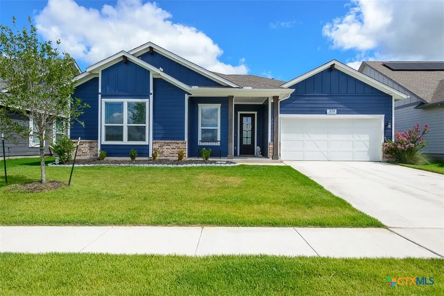 Ideally located in a picturesque neighborhood, this striking blue home catches the eye with its vibrant facade, enhanced by classic brick accents. The beautifully landscaped front yard frames a welcoming front porch, creating an inviting first impression that promises warmth and charm. The immaculate wood floors that flow seamlessly from the entryway through the open-concept living, dining, and kitchen areas sets the tone for this lovely home. The heart of the home is the spacious living room, where a cozy fireplace invites you to unwind and enjoy moments of relaxation with loved ones. The gorgeous kitchen is a chefs dream, featuring a large island with a breakfast bar and a convenient veggie sink. A bold tile backsplash perfectly complements the pristine white cabinetry, while stainless steel appliances, including a gas range, offer modern convenience and style. Granite countertops add a sleek and durable finish, making meal preparation a delight. Retreat to the luxurious owner's suite, where a spa-like bath awaits. Indulge in the walk-in shower or relax in the separate soaking tub. The dual sink vanity provides added convenience, creating a serene space to start and end your day. Step outside to discover a generous covered patio, perfect for outdoor entertaining or enjoying a quiet evening. Privacy walls on both ends ensure seclusion, while ceiling fans keep the space comfortable during warm summer days. This extraordinary home effortlessly blends sophisticated style with practical functionality, making it an ideal sanctuary for those seeking both beauty and comfort.