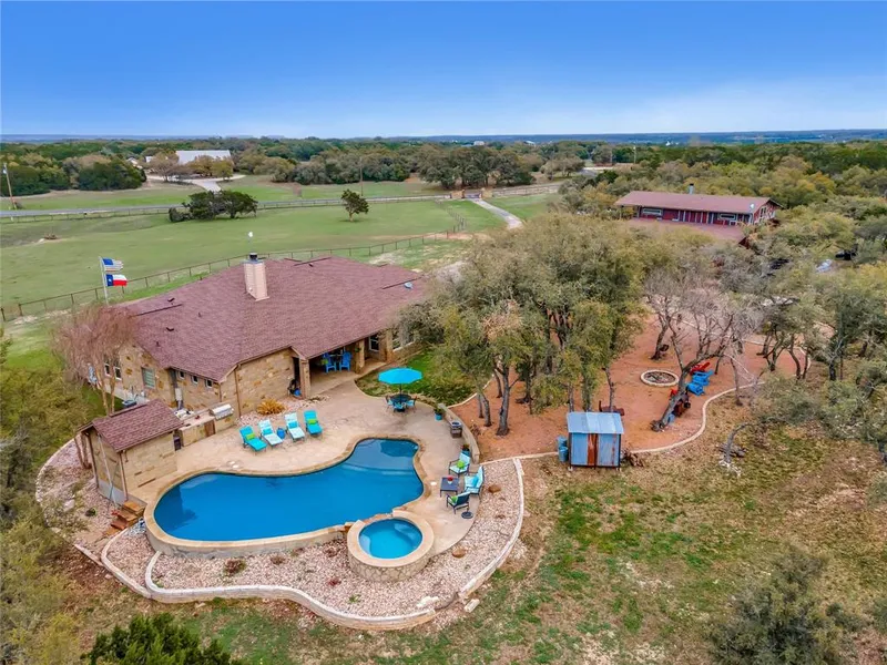Escape city living with your dream 10.77-acre gated equestrian estate in Liberty Hill. Located in Durham Park, the immaculately maintained property has a main home boasting five bedrooms, three with en suite baths, and two living and dining areas. The gourmet kitchen is the heart of the home and a chef's dream, with stainless steel appliances, granite counters, decorative tile backsplash, double ovens, a built-in refrigerator, two pantries, expansive counter space, and a 5-burner gas cooktop with a modern stainless vent hood. The primary suite has access to the backyard through French doors, a jetted tub, comfort-height dual vanities with granite counters, a make-up area, and an oversized walk-in shower with a bench and rainfall shower head. The estate is an entertainer's dream, with many promising activities. Take a swim or relax by the in-ground heated pool with an attached hot tub, play a game of bocce ball, horseshoes, or washers in the tree-covered backyard, roast marshmallows for s'mores, and relax by the fire pit. Enjoy dining under the stars, with dinner cooked in your outdoor kitchen. If you would prefer, the separate man cave/game room, complete with a kitchenette and a three-quarter bath, provides another outlet. Attached to the game room is an oversized workshop for those who like to tinker, which also has two 50-amp RV hookups. Above the workshop, you'll find a perfect one-bedroom guest suite with a fully equipped kitchen, rock fireplace, laundry room, bath, and closet with built-ins. French doors provide access to the balcony, which offers views for miles. For the equestrian-minded, there is a 5-stall barn and a corral. Add some chickens to the large coop if you want fresh eggs. Grow your own vegetables in the irrigated, raised beds. Pick one of the two stocked ponds on the property if fishing is more your speed. The list of amenities on this estate is vast. Please reach out to the listing agent for additional details. You won't want to miss it.