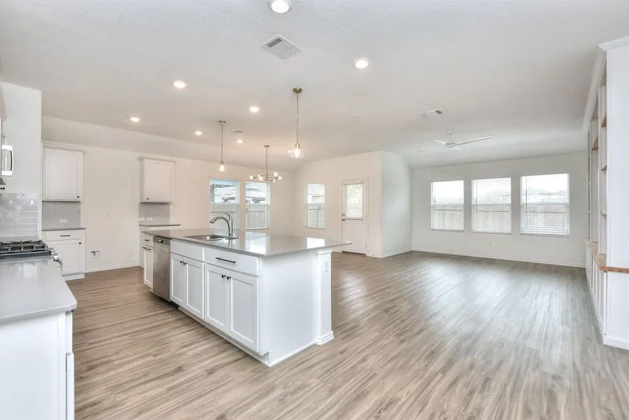 Gorgeous single-level home in the popular Saddle Creek neighborhood in Georgetown, TX! This move-in ready stunner is bright and open with tons of natural light high ceilings. From the front entry, you are greeted with a wide entry hallway with plenty of wall space for decor and your personal touches. Off of the entry hallway you will find 3 generously sized guest rooms PLUS an office/flex space that is perfect for anyone working from home of a great playroom. As you come to the rear of the home you will find an amazing kitchen that has a center island with a breakfast bar and designer lighting. It also has quartz counters, stainless appliances, a walk-in pantry and is open to the family room. The family room is warm and bright from the natural light afforded by the rear windows and high ceiling. The primary suite is large as well, featuring dual vanities, a soaking tub with a sepa...