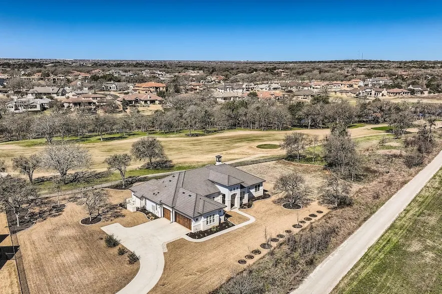 Discover luxury in this exceptional single-story home within the exclusive gated community of Cimarron Hills. With over 300 feet of prime golf course frontage on 1.2 acres, this residence offers views of the 11th fairway on the renowned Jack Nicklaus Signature Golf Course, creating a resort-style retreat. Designed for sophistication and functionality, the open floor plan seamlessly blends refined style with everyday comfort, while an abundance of natural light enhances its inviting atmosphere. The great room features soaring ceilings, fireplace, and large sliding glass doors that showcase golf course views and provide seamless indoor-outdoor living. The chef s kitchen is beautifully appointed with custom cabinetry, quartz countertops, GE Cafe cooktop and double oven, making it ideal for both entertaining and everyday meals. This versatile floor plan offers five bedrooms plus a dedicated office with built-ins or four bedrooms, a media room, and an office. The owners suite is a private sanctuary with golf course views and a spa-inspired ensuite, featuring an extra-deep soaking tub, a walk-in shower, dual vanities, and two spacious walk-in closets. The screened-in back patio is the perfect outdoor retreat, with fairway views ideal for morning coffee, sunset cocktails, and year-round entertaining. Thoughtful elements include reverse osmosis system on kitchen sink, soft-close cabinetry, recessed lighting, a built-in sound system, soaking tubs, Toto bidets, and utility room with a sink and built-in shelving. A whole-house Generac generator provides peace of mind. Power is pre-wired for a pool installation. The three-car garage with a workshop area provides space for vehicles, storage, and golf cart perfect for enjoying Cimarron Hills' amenities, including the golf course, fitness facility, spa, pool, tennis and pickleball courts, and clubhouse with fine dining and social events. Embrace the ultimate golf course lifestyle in one of Texas most sought-after communities!
