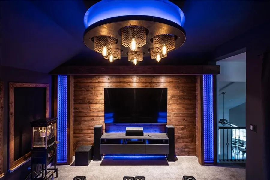 This stunning 4-bedroom, 3-bath, 2,892 sq ft home is located in the highly sought-after master-planned community of Santa Rita Ranch and zoned to award-winning Liberty Hill ISD. Thoughtfully designed and decked out custom upgrades, this open-concept two-story home is filled with natural light from its soaring windows, creating an inviting atmosphere. The heart of the home is a gourmet kitchen that opens seamlessly to the living area-perfect for entertaining and everyday living. It features 42" white Shaker-style cabinets with crown molding, a white subway tile backsplash, stainless steel appliances, a gas cooktop, and an oversized island ideal for breakfast time or casual dining. The spacious living room boasts expansive backyard views and overlooks the elegant wrought iron catwalk on the second floor. The main level offers a private and serene owner's suite with spa-like features, including a frameless glass shower with subway tile, dual vanities, and large windows for soft natural light. Also downstairs is a secondary bedroom with its own full bath-ideal for guests or a dedicated home office. Additional features include smart-home-enabled systems, upgraded finishes throughout. Upstairs, you'll find two generously sized bedrooms, a shared bathroom, and the show-stopping highlight of the home: a custom-built media room fully equipped with surround sound, leather recliners, and cinema-inspired decor! Step outside to the professionally landscaped backyard oasis, featuring a breezy covered patio with a tranquil water feature and a cozy fire pit-perfect for enjoying warm Texas evenings with friends and family. With top-tier schools, resort-style amenities, community events, and easy access to shopping, dining, and more, this Santa Rita Ranch gem offers the perfect blend of comfort, luxury, and lifestyle.