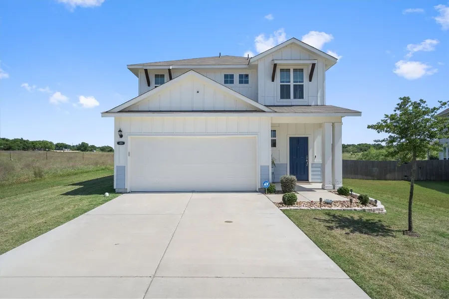 Step into comfort and style with this stunning two-story craftsman-style home built by Brohn Homes in 2022. Thoughtfully designed with an open-concept layout, the main floor seamlessly connects the spacious family room and modern kitchen - perfect for both everyday living and entertaining. The kitchen is a true showstopper, featuring elegant white cabinetry, quartz countertops, a designer backsplash, and sleek stainless-steel appliances. Durable wood-like tile flooring runs throughout the downstairs area, complemented by an abundance of windows that flood the space with natural light. Upstairs, the primary suite offers a peaceful retreat with a well-appointed en-suite bathroom that includes a large walk-in shower and dual sinks. Enjoy your outdoor space year-round with a covered patio ideal for grilling and chilling. The backyard is complete with a full privacy fence and an irrigation system to keep the lawn looking its best. This home features a premium Westinghouse water filtration system allowing crisp, clean water straight from the tap - perfect for health-conscious living. The home is also equipped with state-of-the-art solar panels, dramatically reducing your energy bills while minimizing your carbon footprint. Located across from Jarrell High School, close to downtown Jarrell, and a quick 12-mile drive to Georgetown.