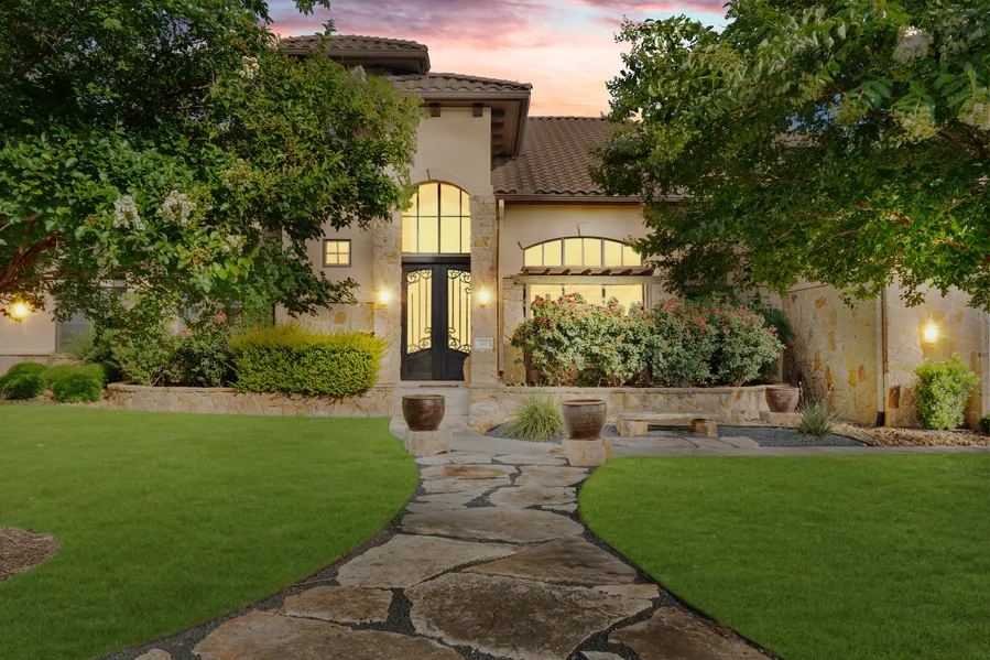 Grand residence in the prestigious Estate Section of Cimarron Hills, one of the community’s most coveted addresses. This custom-built Pinnacle home offers a perfect blend of timeless architecture, expansive views, and refined living, all within the highly desirable Liberty Hill School District and benefiting from a low property tax rate. Situated on a generous lot, the residence showcases hand-troweled walls, travertine flooring, and custom wood cabinetry, all thoughtfully curated to reflect classic European charm. The interior boasts soaring beamed ceilings, intricate trim work, and plantation shutters, complemented by warm Lincoln wood windows and dual fireplaces, indoors and out. Designed for both everyday living and entertaining, the chef’s kitchen features premium KitchenAid and Viking appliances, dual islands, granite counters, a gas cooktop, and double ovens. See photo renderings of kitchen and bath remodel. The main-level primary suite provides a private retreat, complete with outdoor access, a spa-inspired bath, and a spacious walk-in closet. A rich, wood-accented office adds both function and sophistication. Upstairs, a game room with wet bar, three large bedrooms, two full baths, and a bonus space over the garage offer versatile living options. Enjoy the outdoors from two covered patios, an outdoor fireplace, and peaceful views of a seasonal pond. With a stone and stucco exterior, barrel tile roof, and oversized 3-car garage, this property offers both beauty and practicality. Rarely available in this exclusive enclave, this is luxury Hill Country living at its finest.