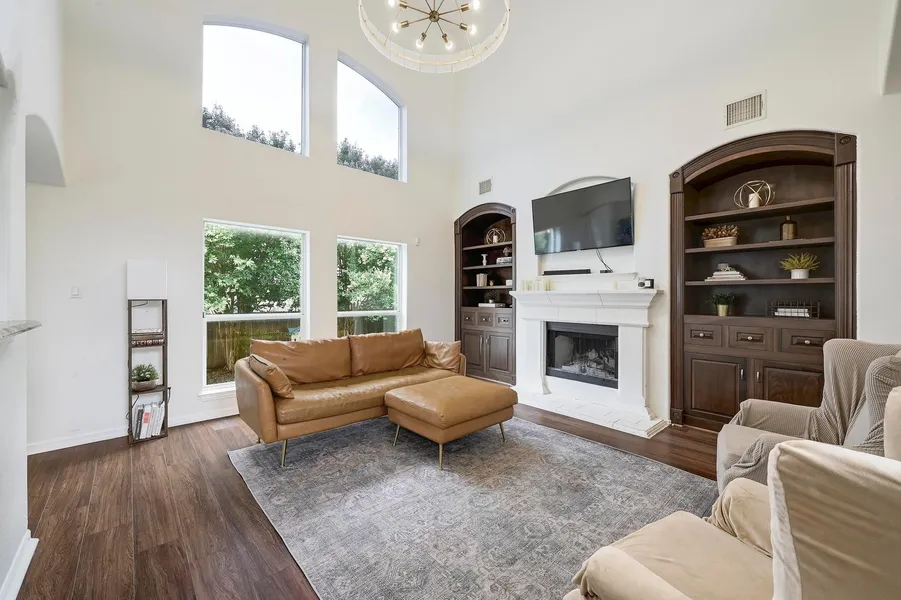 MOTIVATED SELLER. SUBMIT ALL OFFERS. Thoughtfully designed and move-in ready, this 2,747 square foot home offers four spacious bedrooms, two-and-a-half bathrooms, and multiple flexible living and dining spaces to accommodate a variety of needs. Located in the established Eagle Ridge neighborhood, the home welcomes you with a two-story foyer and formal dining room, ideal for hosting gatherings or enjoying quiet dinners at home. The main-level living room features soaring ceilings, large windows, and a wood-burning fireplace flanked by built-in shelving—creating a warm and inviting space to relax or entertain. The adjoining kitchen is equipped with stainless steel appliances, quartz countertops, a tile backsplash, center island, and a generous walk-in pantry. A casual dining area overlooks the backyard and provides easy access to a covered deck—perfect for outdoor dining or unwinding in the shade. The primary bedroom is located on the main floor and features a tray ceiling, bay window seating area, and an oversized en-suite bath with a garden tub, separate shower, dual vanities, and walk-in closet. Upstairs, you'll find three well-proportioned secondary bedrooms—each with walk-in closets—as well as a spacious second living area that offers flexibility for a playroom, media room, or home office. Additional highlights include a large laundry room, powder bath for guests, and an attached two-car garage with built-in storage. The fully fenced backyard provides privacy and plenty of room for play or pets. Enjoy the convenience of being just minutes from highly rated schools, major employers, and easy access to I-35, 1431, and the Round Rock Outlets, along with nearby restaurants, parks, and shopping.