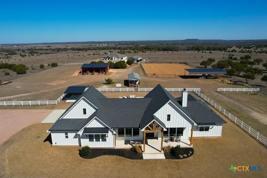 Tucked away on 11 pristine acres in a Liberty Hill, TX gated community, this modern farmhouse is the perfect fusion of luxury, functionality, and rustic charm. With 3,100 square feet of single-story living, this home offers three spacious bedrooms plus a versatile flex/study space, ensuring comfort for both work and relaxation. Every bedroom is a private retreat, complete with its own full bath, while the primary suite elevates the experience with double vanities and separate his-and-hers toilets-a rare and thoughtful touch. The heart of the home is a gourmet kitchen, where sleek quartz countertops and LVP flooring complement the home's warm, modern aesthetic. Step outside, and the possibilities are endless. A pavilion awaits for outdoor entertaining, overlooking the lush 100% Bermuda grass lawn, sustained effortlessly by a full sprinkler system. For equestrian enthusiasts, the property boasts a 36x48 horse barn with four stalls, complete with lean-tos for trailer parking, a roping arena, and ample open space for grazing. Need more room? The 1,800 sq. ft. shop provides endless potential for hobbies, storage, or a workspace. There's even an in-ground storm shelter too! This is more than a home-it's a lifestyle. A place where serenity meets sophistication, where wide-open Texas skies frame your everyday views, and where the possibilities stretch as far as your imagination. No HOA! Welcome to 201 Gatlin Ranch Rd-your personal slice of country paradise.