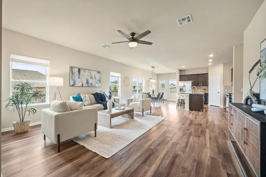 This corner-lot home in Larkspur offers a new roof (Sept 2025), fresh updates, and a versatile four-bedroom, three-bath layout. The primary suite and two bedrooms are on the main level, with a spacious game room, guest suite, and full bath upstairs. Inside features new paint, carpet, and ceiling fans throughout. Enjoy the extended flagstone patio and move-in-ready feel. Larkspur residents enjoy resort-style amenities, fitness center, playgrounds, and trails-all for just $60/month HOA dues. Prime Leander location near HEB, Apple, Dell, and The Domain with a low 2.513% tax rate.