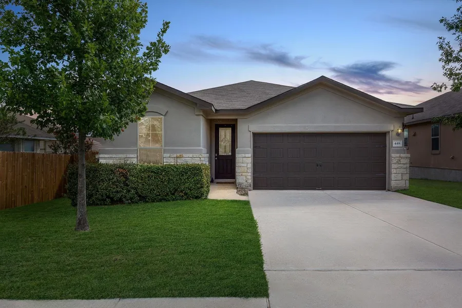 Welcome to 448 Drystone Trail in Liberty Hill, TX! This charming 3-bedroom, 2-bathroom home offers plenty of comfortable living space, sitting on a generous sized lot, one of the largest in the neighborhood. Step inside to find a modern open-concept layout with beautiful tile flooring throughout the main living areas, creating a fresh and cohesive feel. The kitchen is the heart of the home, featuring sleek granite counters, stainless steel appliances, a spacious pantry, and ample cabinet space, perfect for hosting and everyday living. The primary bedroom is thoughtfully positioned for privacy, with plenty of space to unwind. Complete with a walk-in closet and full ensuite bathroom with a soaking tub, walk-in shower and double sinks. Two additional bedrooms offer flexibility for guests, work-from-home needs, or hobbies. The backyard is a true highlight, offering plenty of private outdoor space to relax, entertain, or grill. Complete with a full sprinkler system, making outdoor maintenance a breeze. You'll also enjoy access to an array of community amenities, including a pool, playground, basketball court and common outdoor spaces. This home truly blends comfort, style, and convenience.