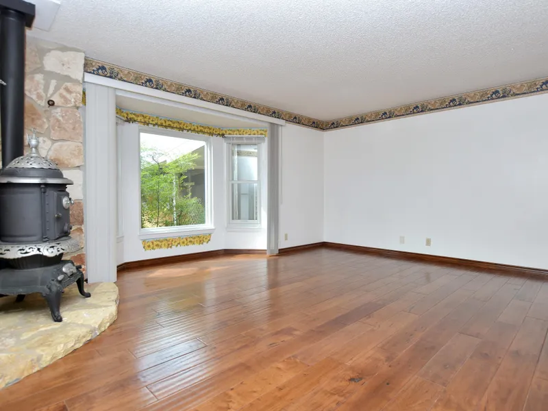 Immaculately maintained one owner home! Beautiful tree covered corner lot. House features magnificent wood flooring, 2 living areas with fireplace and wood burning stove, updated windows, maintenance free vinyl siding, metal roof, closed in back porch (possible office or sitting area), and 4 sides rock. Outside is a smaller storage building with electricity (could be workshop). Horses allowed, community pool, and great location just minutes to town.