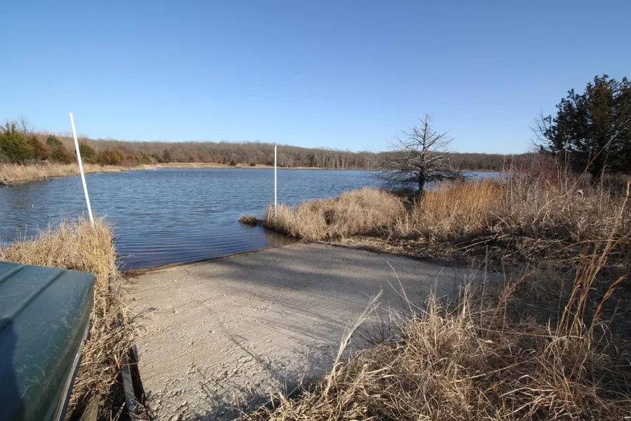 PROPERTY DESCRIPTION: 195.9+- acres of Wilson County, Kansas land for sale with heavy Oak timber, very large elevation changes, unique rock formations, and a beautiful 12 acre lake, and blacktop frontage. The 12 acre lake is spring fed and known for trophy Largemouth Bass fishing. The lake has frequently been supplied by the owner with minnows and crawdads. The quality fishing also includes Black Crappie, Bluegill, and Channel Catfish. The lake has a concrete boat ramp, manmade fish habitat, and natural habitat including flooded timber, rock, and cattails. Additional world class recreation includes both Kansas Whitetail Deer & Wild Turkey hunting. A majority of the property is heavy oak timber with scattered native meadows. Delaware Springs is just east of the property, and it is believed that not only does this help provide water to the lake, but that the Delaware Indians once had a large camp in the area. Indian artifacts have been found on the property. A rural water line and electricity are present along the entire south boundary. This is a very rare opportunity to purchase a property with all the fishing, hunting, and recreation activities turnkey, plus the utilities available to build your dream home or cabin. Quick and easy access just 80+- miles from Wichita Ks, 110+- miles from Tulsa Ok, and 145+- miles from Kansas City Ks.