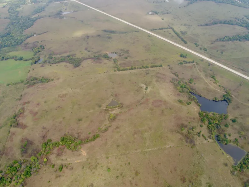 PROPERTY DESCRIPTION: 156.49 surveyed acres of native pasture with 4 ponds, large rolling hills, elevation changes, and timber. There are several timber lined draws with excellent Kansas Whitetail Deer hunting. A unique feature of this property is the blacktop highway access, but due to the terrain it is not visible from the road. That privacy adds to the appeal of this property. The large 2 acre clear water pond offers a high quality body of water for fishing and waterfowl hunting. Three other ponds offer both recreation and good water for livestock. The pasture is cross fenced into two livestock grazing units. Great location, great access, and an excellent combination of Agriculture and Recreation! Invest In Kansas Land!