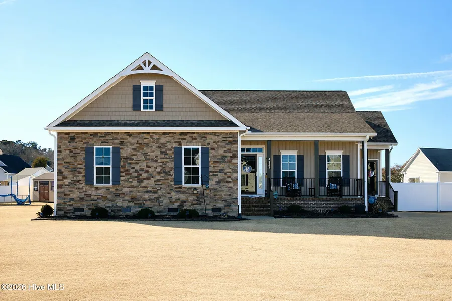 The Perfect Blend of Southern Charm and Modern Comfort! From the moment you pull into the driveway, this stunning craftsman-style home welcomes you with its striking stone exterior and a classic rocking-chair front porch. Inside, the heart of the home is a spacious living room featuring soaring vaulted ceilings and custom floor-to-ceiling built-ins that are as functional as they are beautiful. The kitchen is a chef's dream, boasting crisp white cabinetry, granite countertops, and a convenient breakfast bar for morning coffee. Retreat to the primary suite, where you'll find elegant tray ceilings and a spa-like ensuite with a double vanity. The outdoor living space is a true private oasis, featuring a fully fenced yard, an above-ground pool with a dedicated deck, and a large storage shed. Whether you're hosting summer pool parties or cozying up by the built-ins, this home is ready for its ...