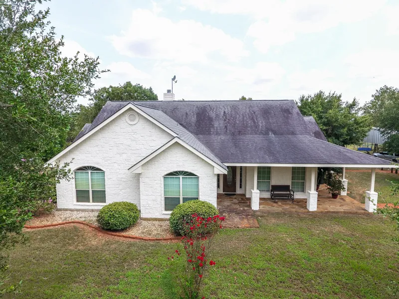This Gorgeous Ranch-style Masonry home on 15 tree studded acres. Beautiful 3 bedroom, 2.5 bath, office, open living Dining kitchen all together, high cathedral ceiling with wood beams. Kitchen boast lots of Silestone counters, gorgeous custom hickory cabinets. Flagstone front & back porches, lots of landscaping. Playscape, green house, improvements include: 50"x90' covered area for all your parking needs. RV bay. Storage/Shop, Barn. Fenced and Cross-fenced. Low maintenance home very energy efficient.