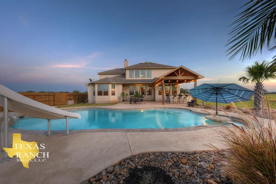 The stunning main home is a 4,591 square-foot two-story home with five bedrooms and four bathrooms. The home boasts open concept living with high ceilings and a floor to ceiling stone fireplace in the living room, granite countertops in the kitchen and a formal dining room and breakfast room. The office is on a split level between floors with a great loft overlook into entry. The back patio has an outdoor kitchen and in-ground pool overlooking the beautiful rolling hills, providing exceptional sunset views.